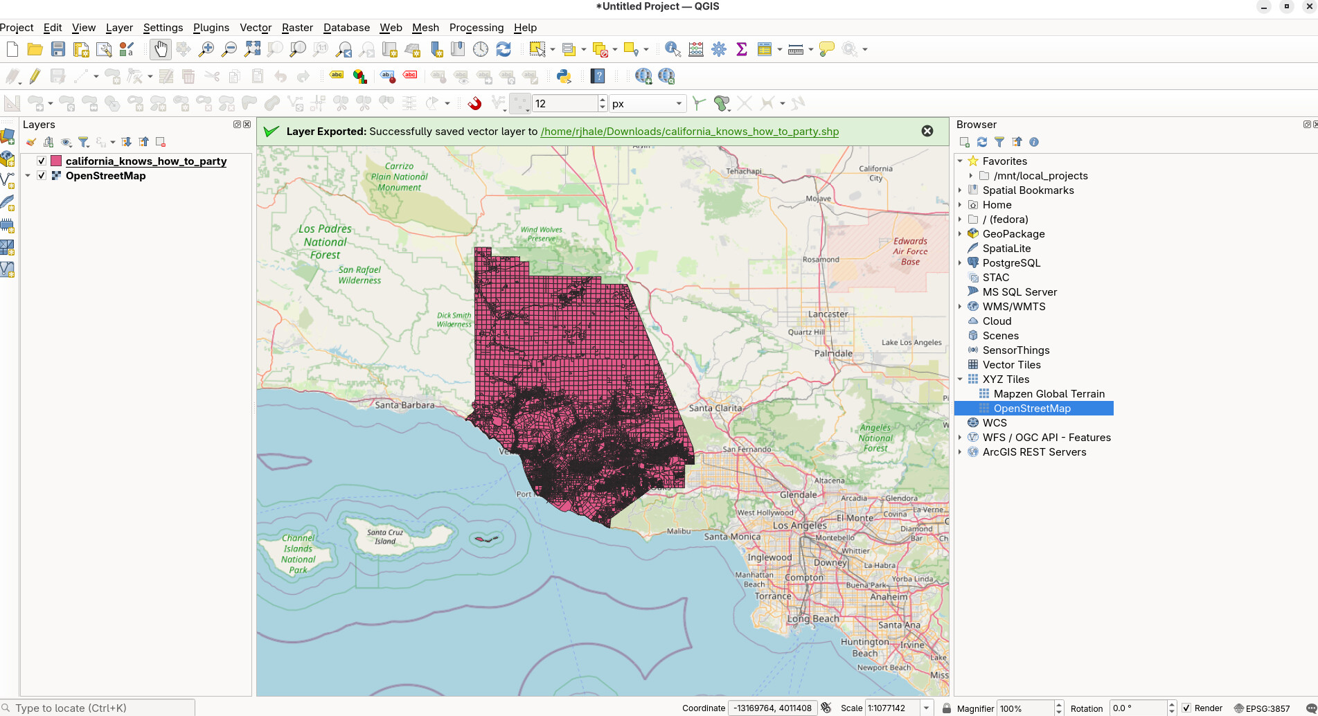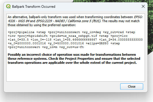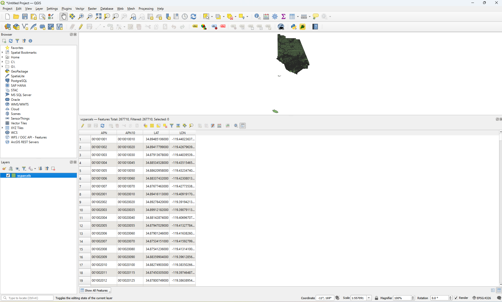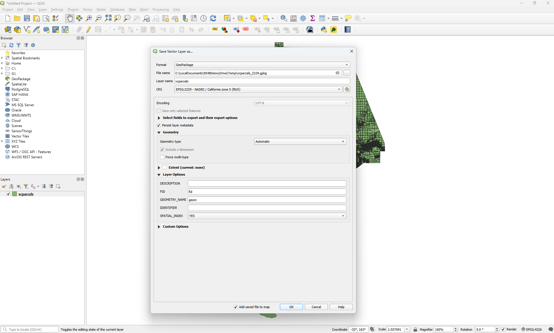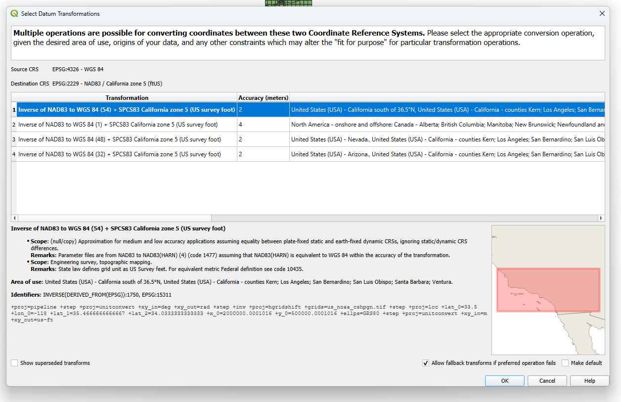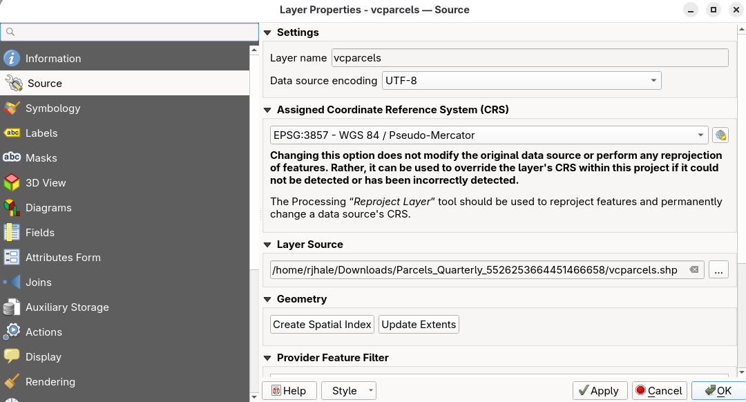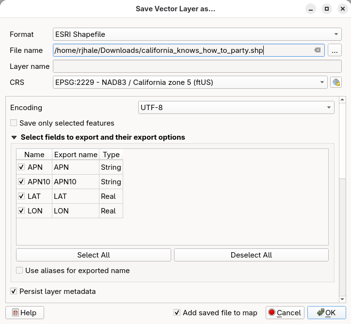 I have a Shapefile downloaded from Ventura County’s website of parcel polygons and APN data…. the Attributes Table of the Shapefile is shown in the screenshots….. I set the layers CRS to 4326, WGS84 and the project co-ordinates system to 4326 WGS84 and I can see the map. Then I try to use the right click context menu for the layer Export → Save Features As → and I get a series of warning dialog boxes to come up. After those are gone through, I try to View → Zoom Full, however the newly created layer where the new 2229:NAD83 co-ordinate system of the same map now converted is supposed to be and there seems to be nothing there at all to view after changing the project co-ordinate system to 2229:NAD83 and removing all the old layers and using View → Zoom Full only a blank client area of the window is there to look at.
