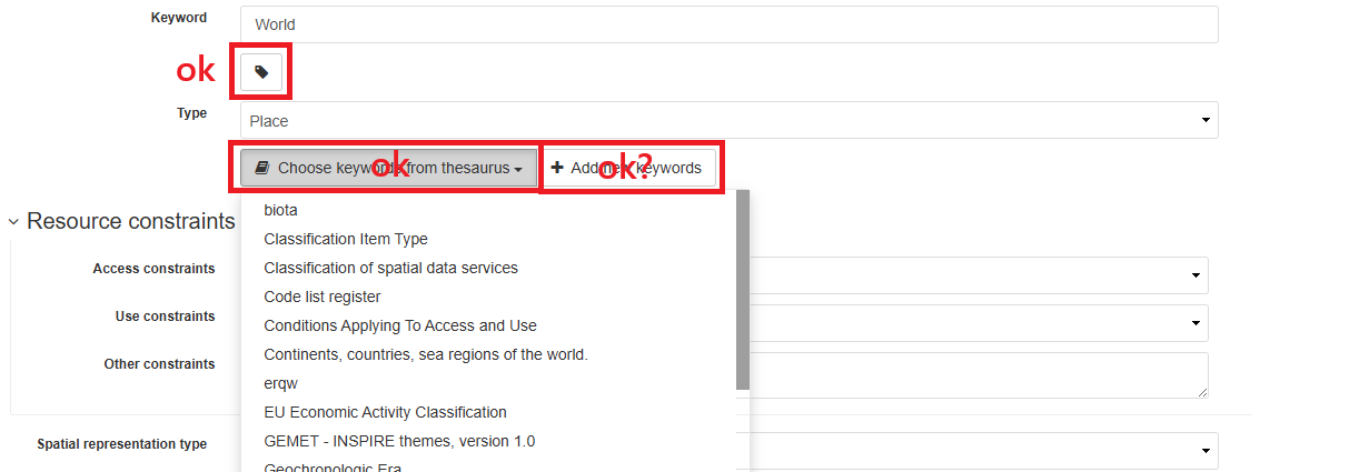INSPIRE themes thesaurus is available in 4.4.9 from scratch and choosing it from the 'Choose keywords form thesaurus’ dropdown menu does add a kewords section. We have also added GEMET Concepts thesaurus and it’s working. It is the ‘Add new keywords’ button that is not working in the Simple view. It does using the Full view.
