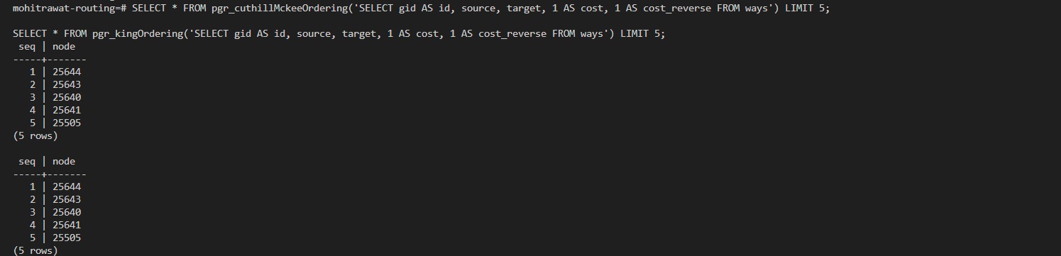 While testing the ordering algorithms, I ran both pgr_cuthillMckeeOrdering and pgr_kingOrdering on the same OSM-derived graph. Both functions returned identical node orders, which matches the “reverse” order as described in the Cuthill-McKee documentation. However, the King Ordering documentation doesn’t mention that it returns the reverse order, which could confuse users.