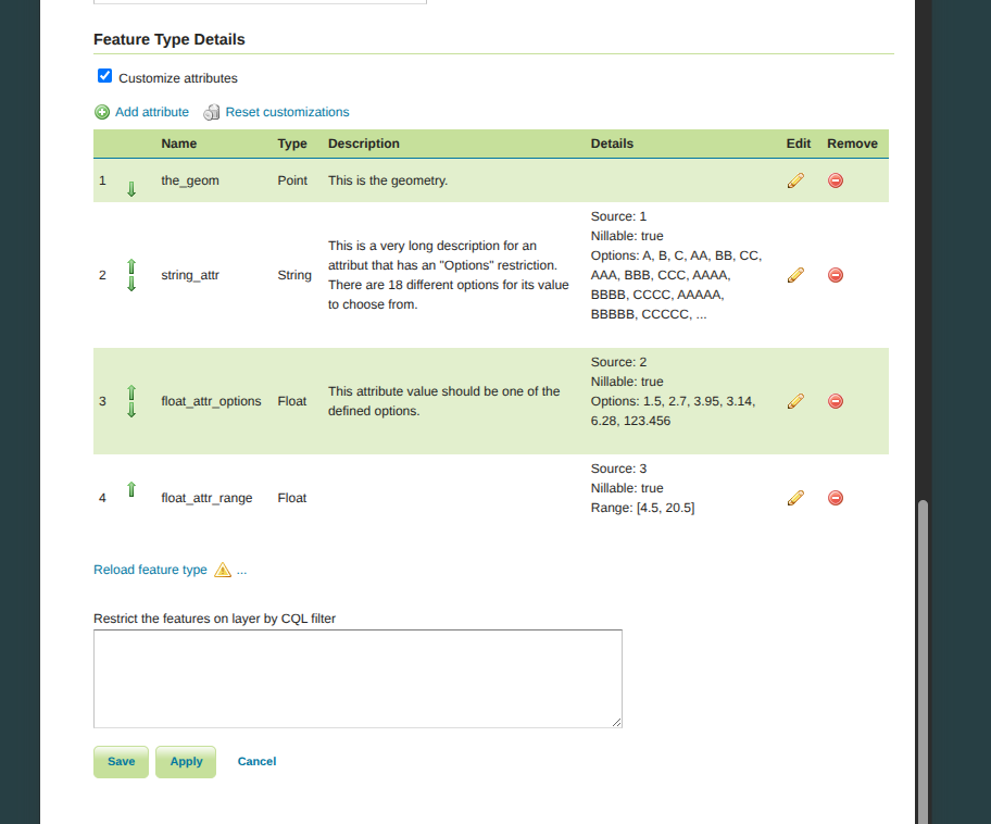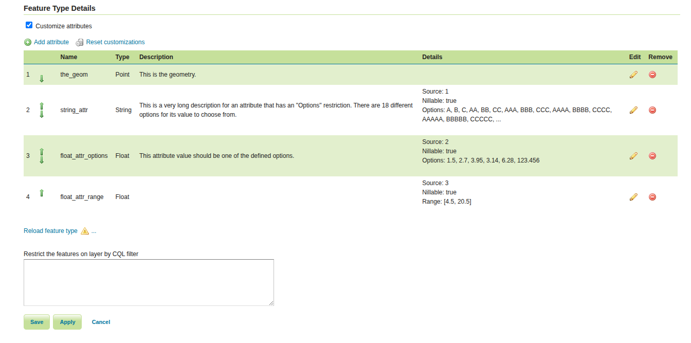 This proposal introduces support for defining, advertising, and enforcing restrictions on feature type attributes in GeoServer. The goal is to improve data integrity and support clients by: