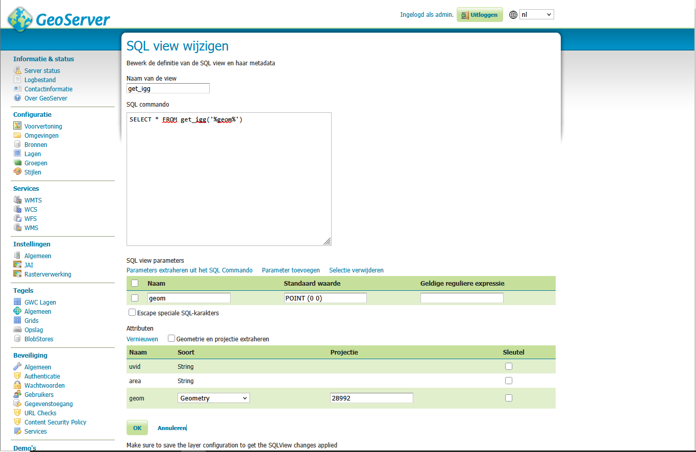 Then I configured a new SQL view in geoserver like this: