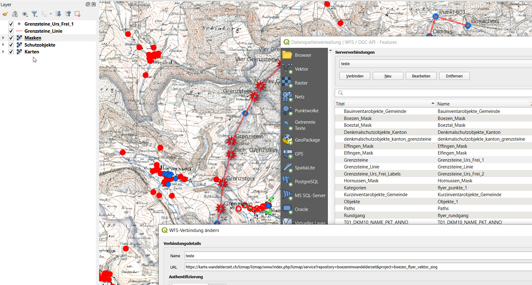 Lizmap offeriert über die “Metadaten Anzeige” Zugang zu WMS, WMTS und WFS. Bisher habe ich es nicht fertig gebracht diese URLs in einem QGIS Projekt zum Laufen zu bringen. Wenn ich die URLs im Browser ansehe, Beispiel karte.wandelderzeit.ch/lizmap/lizmap/www/index.php/lizmap/service?repository=boezenimwandelderzeit&project=boezen_flyer_vektor_sing&SERVICE=WMTS&VERSION=1.0.0&REQUEST=GetCapabilities sieht alles vernünftig aus aber QGIS kann damit nichts anfangen. Ich weiss, dass zumindest Günter Wagner dies verwendet. Gibt es noch zusätzliche Aktionen die dafür notwendig sind? Oder weitere Tips wie man es macht?